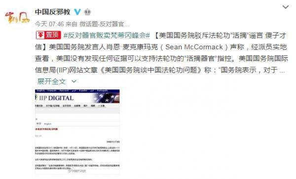 今天(7日),凯风网官方微博@中国反邪教援引美国国务院此前立场称,“活摘器官”是谣言,“傻子才信。”