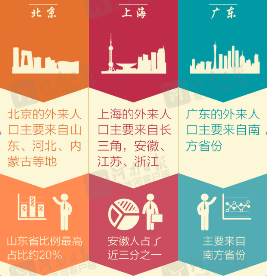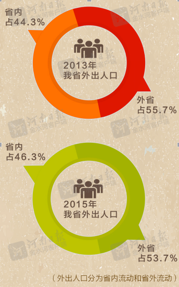 同时根据“十二五”河南人口发展报告,2014年,到省外的河南人口比重首次出现了下降,2015年继续降低。截至2015年,我省全部外出人口中,外出地在省内的占46.3%,在省外的占53.7%。