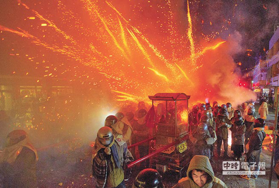 在台南市盐水武庙元宵节蜂炮活动现场,蜂炮点燃时万炮齐发,拖着焰火尾巴如蜂群倾巢而出,射向四方。每年元宵放烽炮的过程中还有神轿在蜂炮中穿梭,神轿所到之处各种蜂炮烟火,爆竹冲透云霄,声声如雷,满天烽火既美丽又壮观。当地习俗相信蜂炮放得越多、蜂炮挨得越多,这一年的财运也会越来越好。