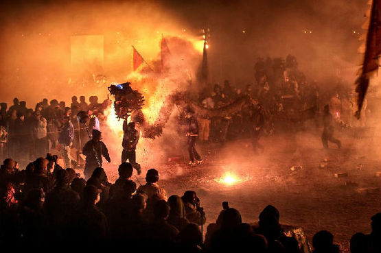 表演的场地放满了鞭炮与大龙炮外,参与表演的庙宫与围观的群众也会不断在马路旁点放鞭炮(大龙炮是一种声音很大也会喷火喷烟的鞭炮)。所以在活动的过程中就可以看到群龙在烟雾与鞭炮的火光中穿梭,再配合传统舞龙的敲锣打鼓,就好像真的有龙神下凡来帮大家祈福,保佑未来风调雨顺。在苗栗客家人的习俗认为把龙炸的越烂越好,这样明年就可以旺整年。