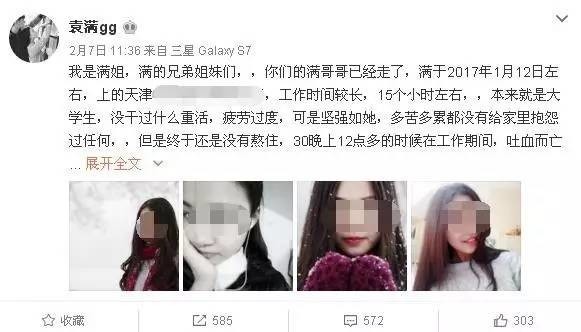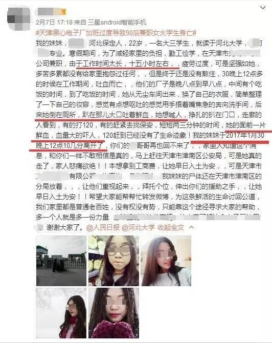 今天上午,记者在新浪微博找到了网友@袁满gg 2月7日发的这条微博。微博中称,妹妹22岁,河北保定人,是河北大学工商管理专业大三学生。寒假期间,为了减轻家里的负担,勤工俭学,在天津一家公司兼职,由于工作时间太长,十五小时左右。1月30日晚上12点多,其走出车间后不久,吐血而亡。