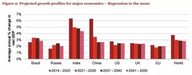 若按PPP计算,到2050年,中国的GDP高居榜首,印度超过美国成为第二。印尼、巴西、俄罗斯和墨西哥都超过了日本、德国及英国。普华永道还认为,当脱欧过渡期影响逐渐消退,英国经济增速有潜力超过欧盟国家的平均增速。