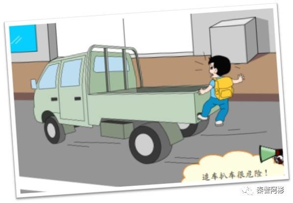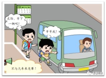 1—9、不要扒车、追车、抛物击车 不要因为好玩,就去追赶行驶中的车辆,要是撞上行人、电线杆或电话亭等物体,会伤的不轻。如果扒着车,跟着车跑,车辆突然停下来,还有可能直接被车辆撞倒.另外,汽车在高速行驶时,撞上飞来的物体,冲击力非常大,往往会造成非常可怕的后果。