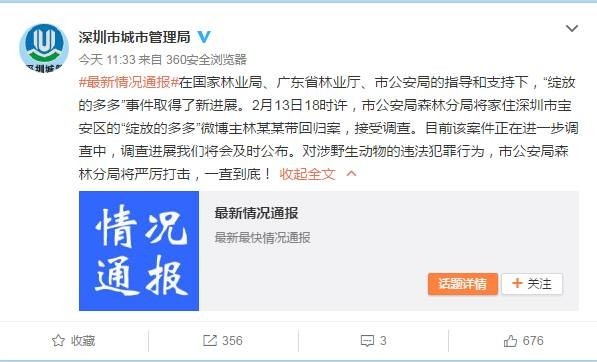据深圳市城市管理局官方微博消息,在国家林业局、广东省林业厅、市公安局的指导和支持下,“绽放的多多”事件取得了新进展。2月13日18时许,市公安局森林分局将家住深圳市宝安区的“绽放的多多”微博主林某某带回归案,接受调查。目前该案件正在进一步调查中,调查进展将会及时公布。对涉野生动物的违法犯罪行为,市公安局森林分局将严厉打击,一查到底!