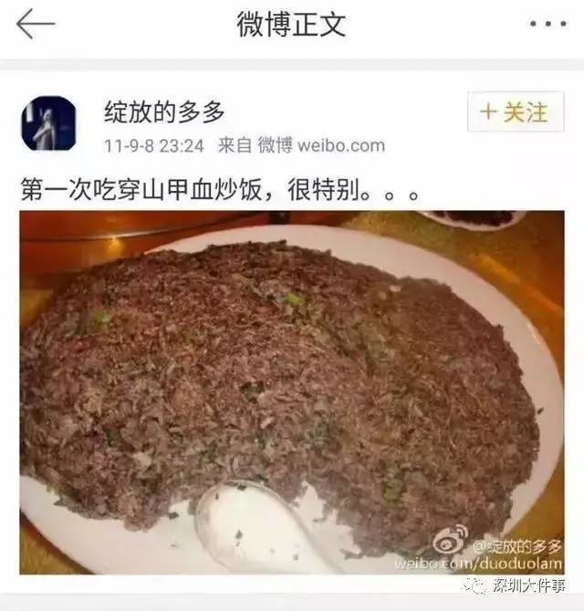 实际上,该位女子微博内容在美食上可谓匠心独特,你看,她吃穿山甲讲究的“套餐”,不管是穿山甲的肉和鳞片,甚至血都能做出美味佳肴来。