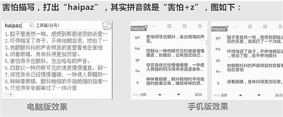 举个例子,如果想要描写人的眉毛,只要输入“meimao+z”,便会跳出好几页的内容,描写都很言情,例如“在他眉峰的皱蹙之间,隐隐蕴藏着一股杀气、一股风雷”等。