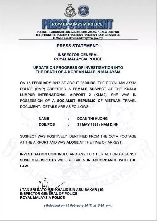 马来西亚《新海峡时报》15日称,马警察总长卡立当天表示,警方15日上午8时许在吉隆坡国际机场逮捕了一名持越南护照的29岁女性嫌犯,警方通过事发当天的监控录像确认了其身份,被捕时女子只身一人。卡立说,调查还在继续,警方将根据法律采取下一步行动。