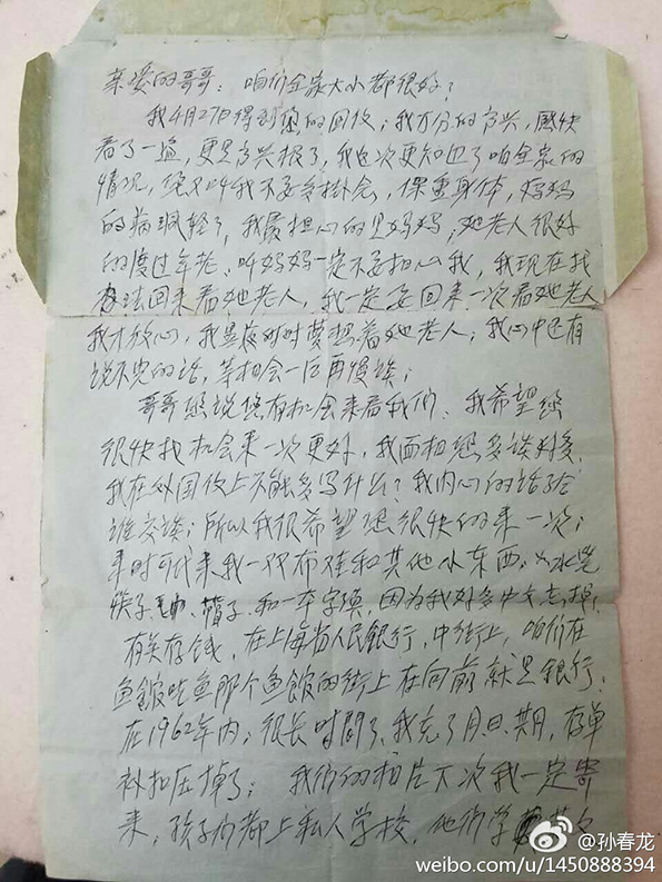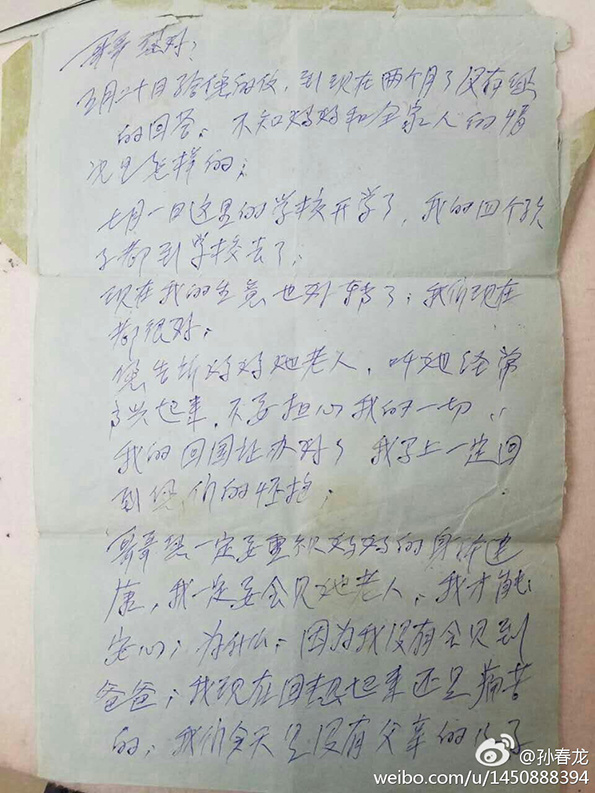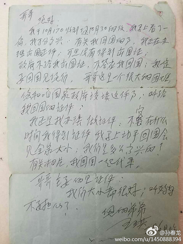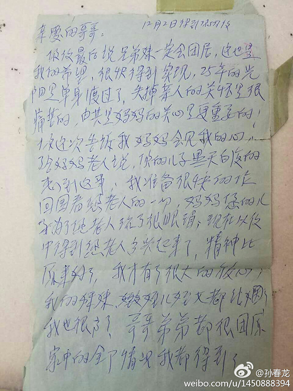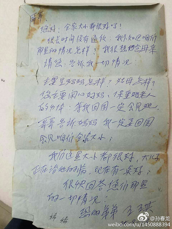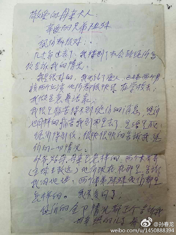 “敬爱的母亲大人,亲爱的兄弟姐妹:几十年过去了……我是很好的,我也有了爱人,生了男孩和两个女孩,他们都很快乐,现在我做生意养活家。我很是痛苦得不到您的消息……”