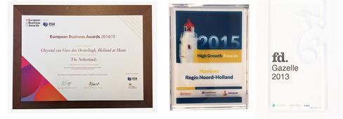 (荷兰之家部分所获奖项 从左至右:RSM企业家年度大奖、2015最佳商业奖、2013年FD瞪羚奖)