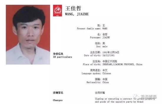 公开报道显示,王佳哲,1961年12月出生,外逃前供职于辽宁日报社,其犯罪原因系涉嫌合同诈骗犯罪,2011年11月18日由国际刑警组织发布红色通缉令,国际刑警组织红色通缉令号码A-7035/11-2011。