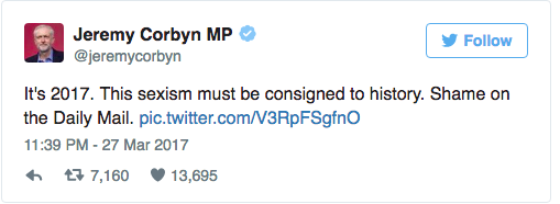 工党领袖Jeremy Corbyn“这都2017年了...我以为性别歧视早就是过去了...dailymail真嫑脸啊!”