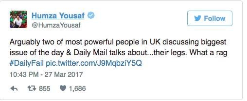 苏格兰交通部长Humza Yousaf:“两个最有权力的女性在讨论英国最大的问题...dailymail在谈论他们的...的腿...真是讽刺啊…”