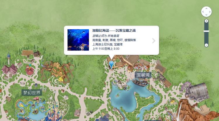 项目内容:游客坐在轨道带动的游船上进入各个场景,本主题为杰克船长的寻宝之战,配合穹顶的投影效果重现电影中的各个经典场景,一定会引起《加勒比海盗》粉丝们的共鸣。