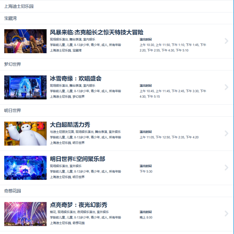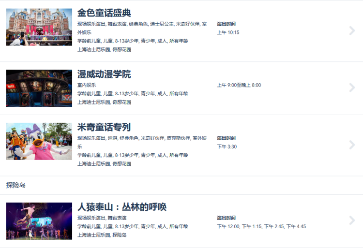 除了狮子王的演出需要单独购票且全天只有一场外,其他演出都不需要另付费且全天有多个演出场次,具体时间大家可以参看下图。