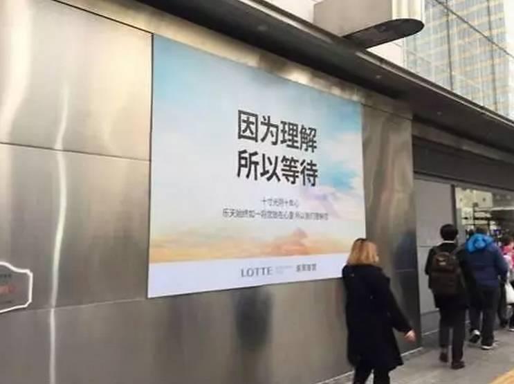 3月24日起,首尔明洞的乐天百货和7-ELEVEN便利店,以及乐天百货蚕室店等商圈,用中文书写的“因为理解,所以等待”的宣传广告随处可见。