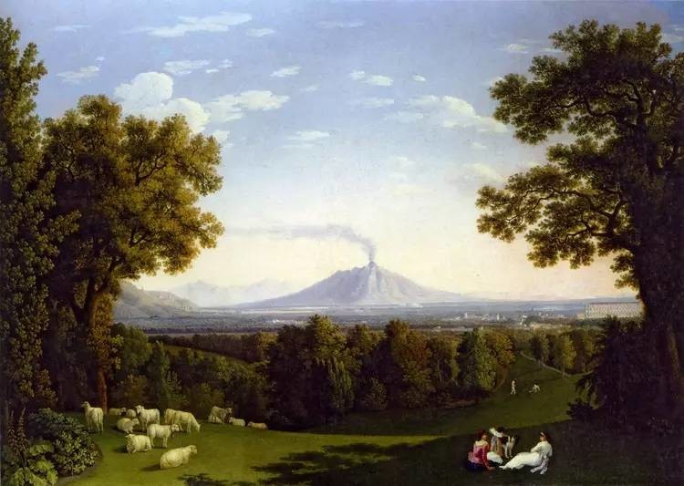 《1793年卡塞塔宫的英国花园的景色》(Landscape with Motifs of the English Garden in Caserta,1793),作者Jakob Philipp Hackert,作于1793年。画面中,人们正在王宫里牧羊,背景是维苏威火山,正在冒烟。