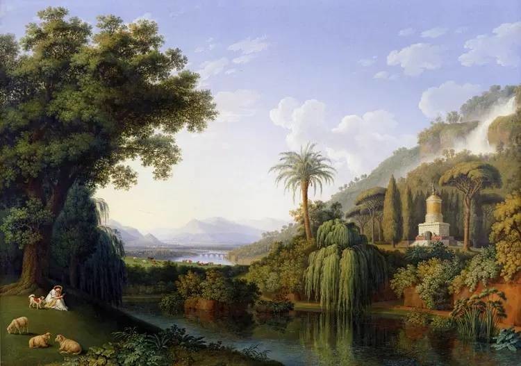 《1797年卡塞塔宫的英国花园的景色》(Landscape with Motifs of the English Garden in Caserta,1797),作者Jakob Philipp Hackert,作于1797年。