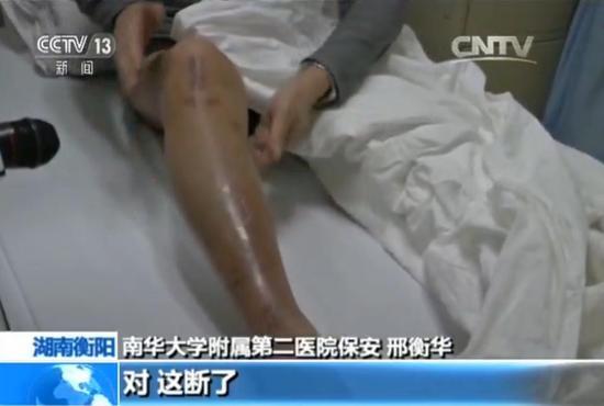 南华大学附属第二医院保安邢衡华:缝了8针,还有腿。