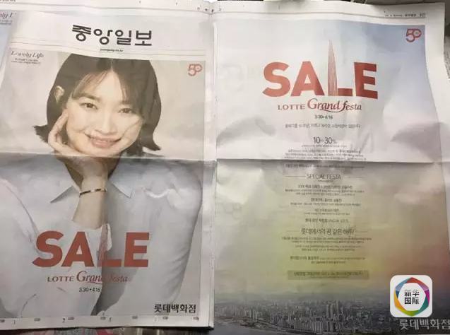韩国媒体毫不吝啬版面地展示了乐天促销打折的广告。《中央日报》甚至将乐天打折,放在了头版头条!