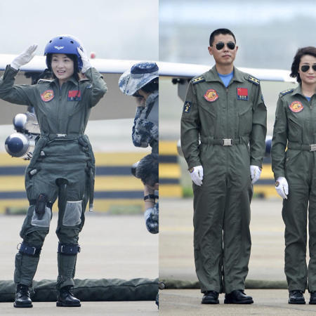2014年11月11日,广东珠海,左图为崇州籍女飞行员余旭穿好抗核服后敬礼;右图为余旭和一位男队员正在为表演做准备。据悉,驻扎在天津某机场的八一飞行表演队的一架飞机,在飞行训练中发生严重事故,驾驶这一架飞机的男飞行员跳伞成功但受伤,而女飞行员余旭则在事故中牺牲。