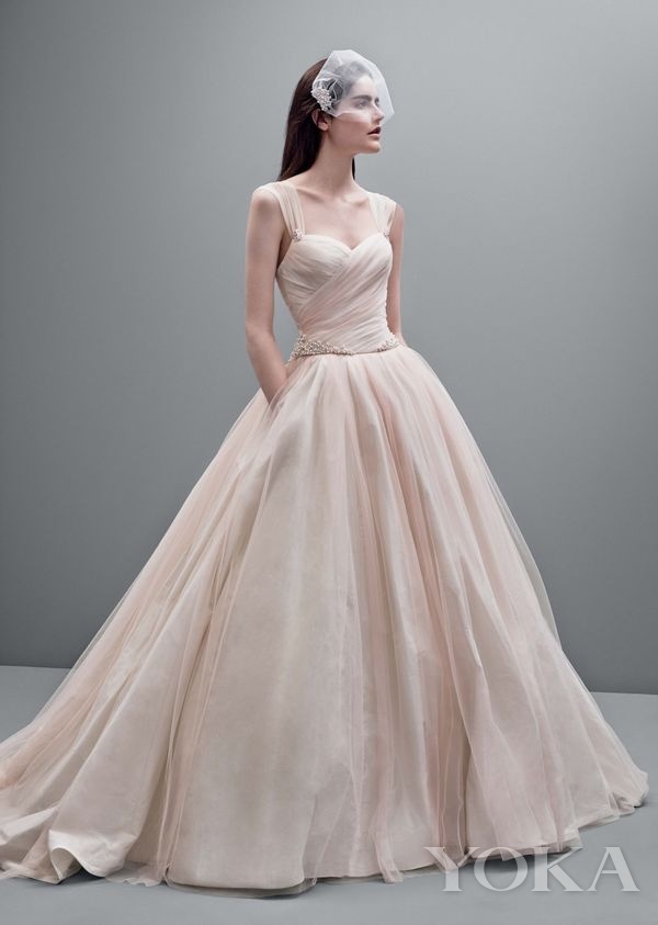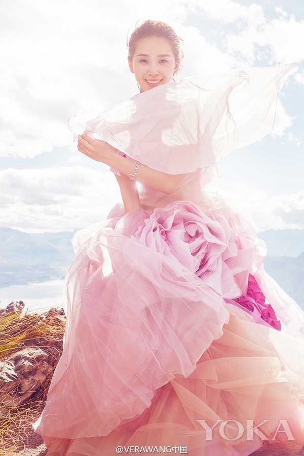 2016年,在新西兰拍摄婚纱照的刘诗诗,也穿了一件Vera Wang 2014秋冬系列粉色婚纱,浪漫甜美充满仙气,还有减龄的效果。