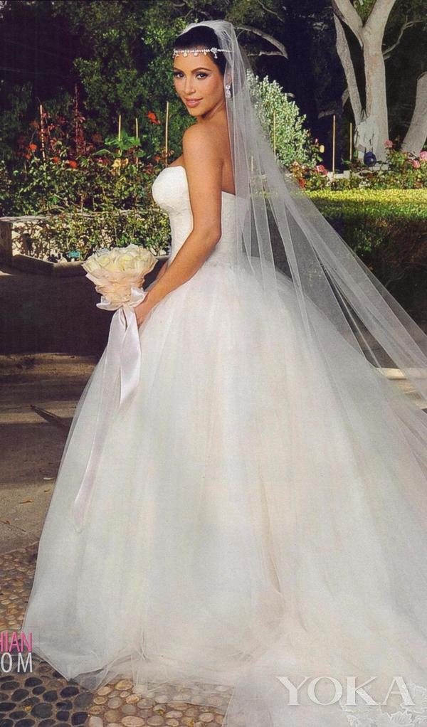 2011年11月4日,金·卡戴珊与NBA球星亨弗里斯大婚时穿得就是Vera Wang婚纱,简约的设计完美凸显了她傲人的身材,独特的头饰提升了整体的气质。