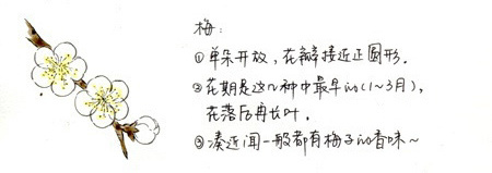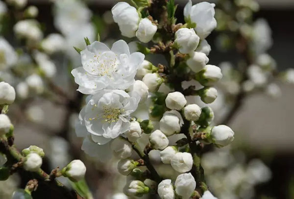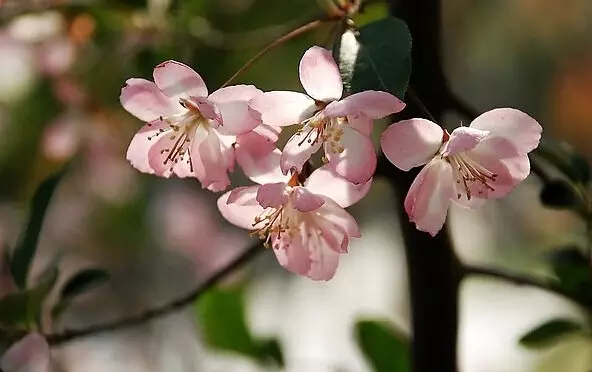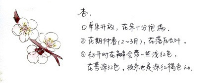 2、花先叶开放,花瓣倒卵形或近圆形,淡红色或白色。