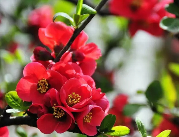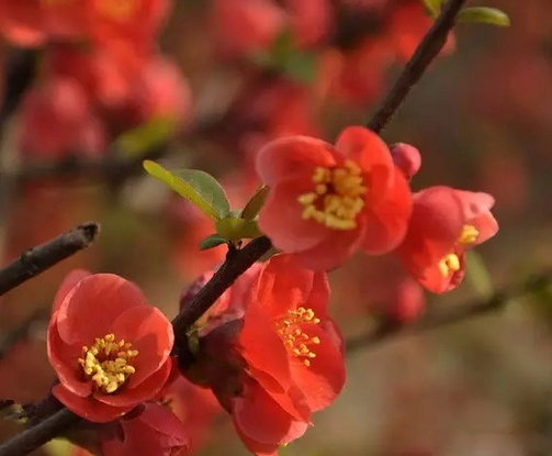 3、花梗短粗,花瓣倒卵形或近圆形,猩红色,稀淡红色或白色。