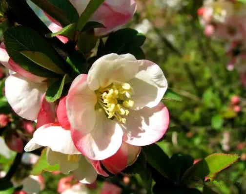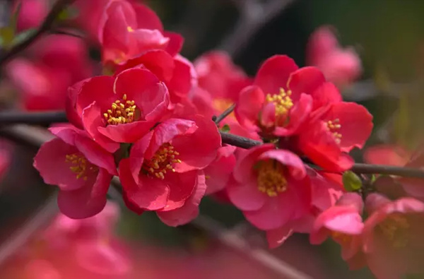 个子最矮、一丛丛地贴在地上,花瓣也贴在花梗上长的,是贴梗海棠,有粉白色,也有大红色;