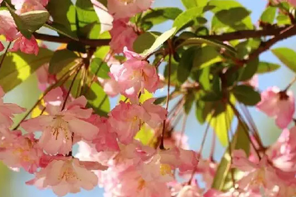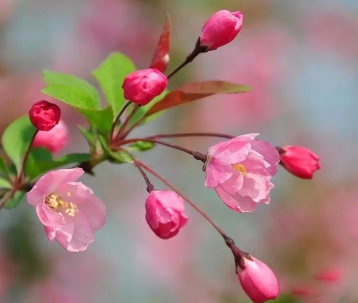 还有垂丝海棠,粉红色的花朵连着长长的花柄,花儿一朵朵垂下来,因此得名。