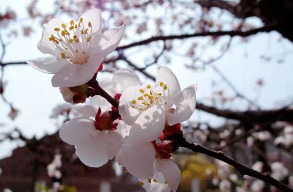 杏花也没有花柄,但它一般是一簇簇挤在一起贴着花枝开,花瓣圆圆的很像梅花,但是花萼鲜红,颜色分明。
