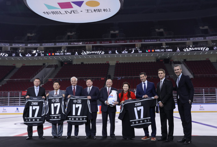 ▲ 周云杰(左一)出现在NHL中国赛新闻发布会上。