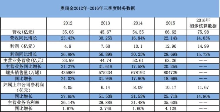 2012年上市后,奥瑞金经历了快速增长,尤其是2013年,当年营收同比增长达到了30.25%,利润增长高达56.89%,净利润增长达到51.53%。但此后,该公司利润和净利润的增长都在逐步放缓,2013-2015年的净利润增长速度分别为51.53%、31.53%、25.71%。2016年第1季度,奥瑞金的营收同比增长仅有3.11%,上半年营收增长速度也不过3.85%,2016年的业绩快报显示,2016年营收同比增长为14.05%,并且,在2016年上半年其主营业务金属包装的营收出现了-2.53%的负增长,净利润增长仅为10.61%,和往年动辄30%左右的净利润增长形成了鲜明对比。奥瑞金初步核算的2016年全年14.80%净利润增长,为历年最低。