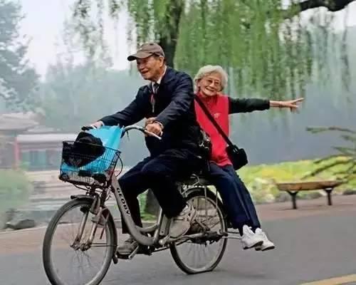 在学生时代认识他,年轻时,就骑车,你前座,我后座;毕业了,还牵着,风雨大,一块走;等老了,轧马路,你左手,我右手。