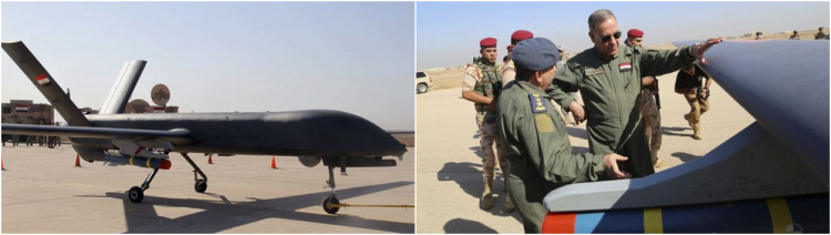 图片:伊拉克空军装备的中国“彩虹”-4无人机,右图是伊拉克军官向外国联络官介绍无人机和AR-1空对地导弹。