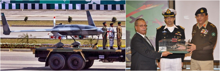 图片:巴基斯坦阅兵式上的“布拉克”/“彩虹”-3无人机,右为巴仿制厂方代表向军方赠送该机模型。