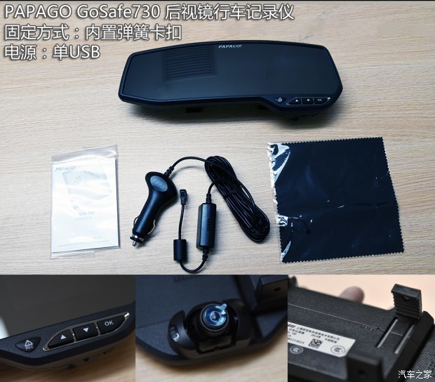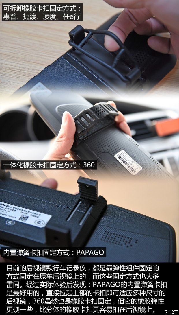 外观配件方面,其实大家都差不多,只是在后视镜的固定方式和内置显示屏上略有不同,从实际感受来看,PAPAGO的内置弹簧卡扣是最好用的,卡扣上有橡胶材质,可以避免划伤原车后视镜,伸缩弹簧的设计可以适应多种尺寸的后视镜。其次就是橡胶的分体卡扣,使用上完全没问题,只是相对内置弹簧卡扣而言,要繁琐一些,橡胶卡扣上都有不同的挡位位,根据后视镜尺寸可以选择要卡在什么位置。