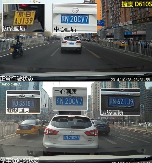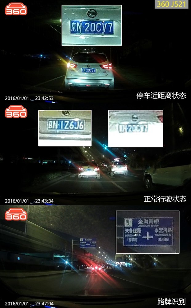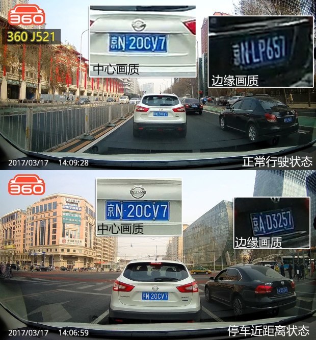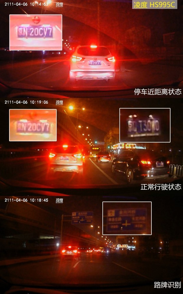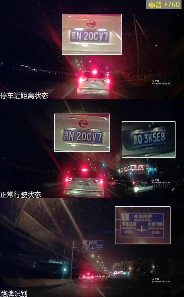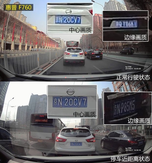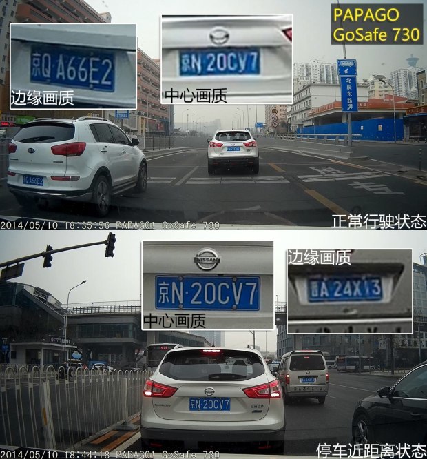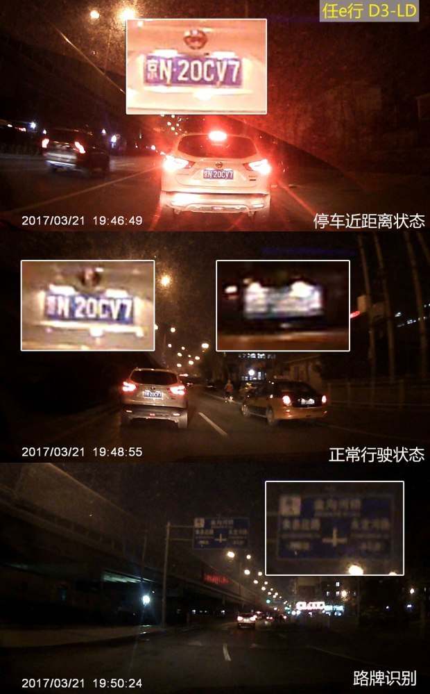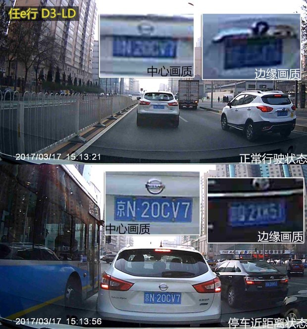 从上面的原画面截图可以发现,PAPAGO、捷渡、360的画质排在了第一梯队,无论是正常行驶的抓拍画面还是等红灯时截取的近距离画面,中心画质和边缘画质都可以让人满意。而惠普则紧跟其后,边缘画质方面差了一些。凌度和任e行的画质排在最后,近距离的解析度还可以,一旦走起来拉开点距离,就很难辨别中心和边缘的车牌号了。