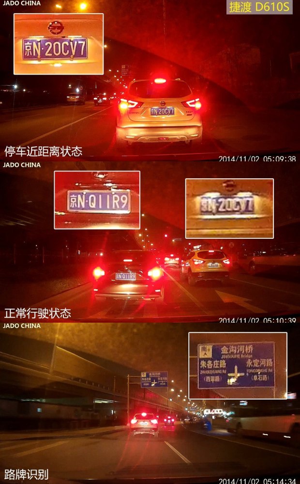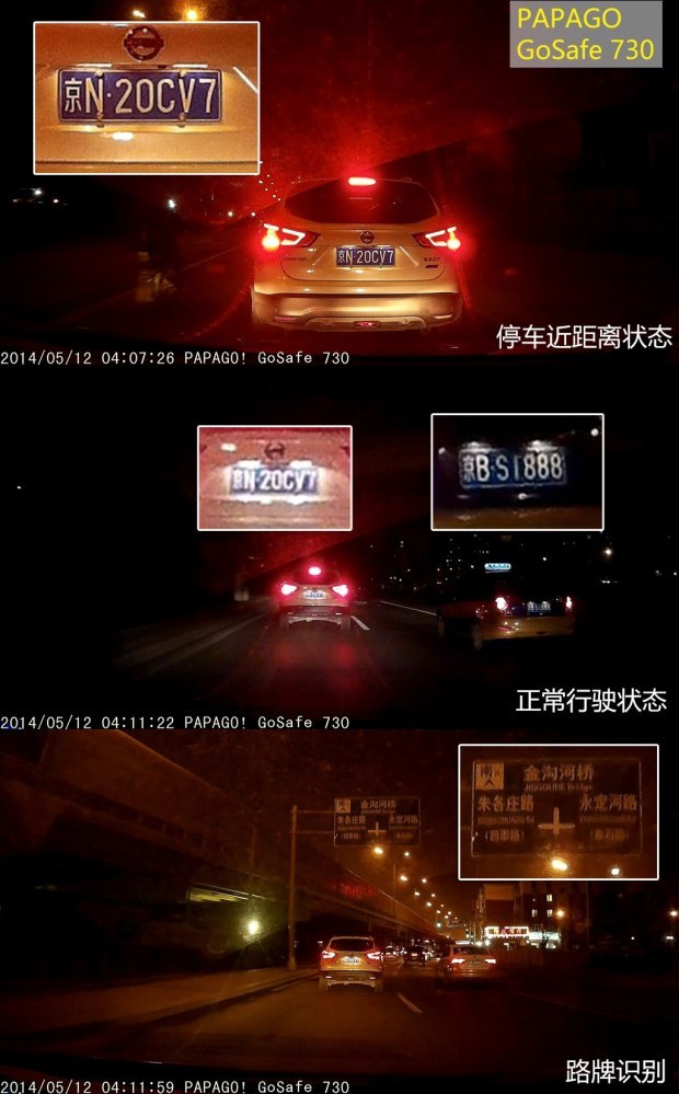 看完了白天的动态表现,咱们继续看看这些记录仪在晚上的画面表现,根据以往经验,记录仪晚上的表现肯定大幅度低于白天,但要说会低多少,还得测过才知道。和白天一样,我们安排了同样的“间谍车”混在车流中,以此来尽量固定画面采集主体。