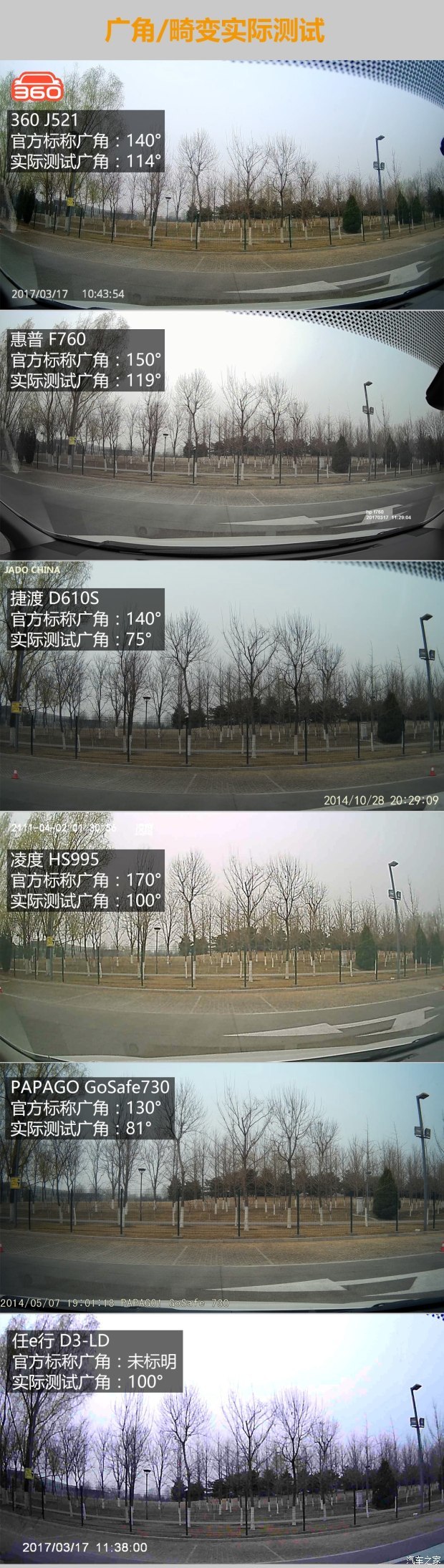 经过实际测试,本次横评中视角最大的是惠普的记录仪产品,实际光角度达到了119°,官方标称为150°,有31°的虚标范围,但也算是够用了。其次为360的产品,达到了114°,官方标称140°,虚标范围26°。凌度的产品官方标称为170°,实际广角100°。捷渡的产品官方标称140°,实际角度只有75°。成为了本次横评角度最小的产品。