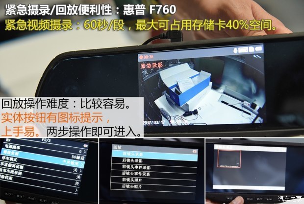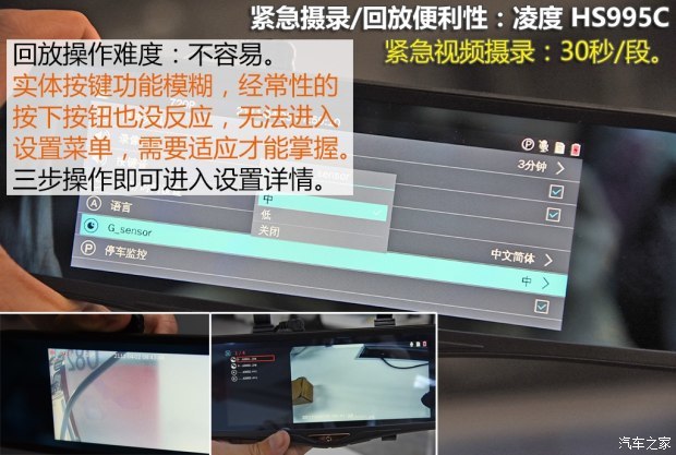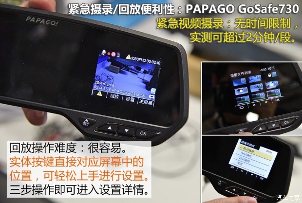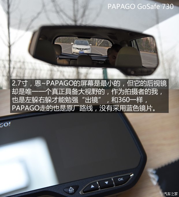 在之前的测试中,PAPAGO无论是画质表现还是广角程度,都是拔尖的成绩,而在这次后视镜款记录仪横评中,它的硬实力似乎缩减了,广角只有81°但除此之外,几乎就没什么硬伤和缺点了,摄录水平依旧是老牌劲旅的水准,画质清晰,车牌识别也不差,菜单操作也是最顺手的,虽然不具备任何辅助或者扩展功能,只有最为基础但实用的摄录功能,但整体水准却和当年无异,和360一样,