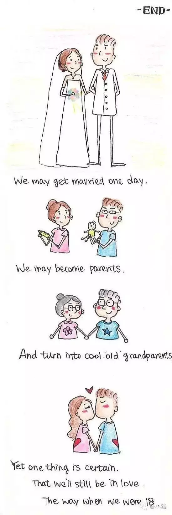 (英文翻译:有一天,我们可能会结婚,有一天,我们可能会成为父母,然后慢慢的,我们变成了一对时髦的爷爷奶奶……但有一件事是肯定的,那就是不论过了多久,我们仍然会像18岁恋爱时的模样,爱着对方……)