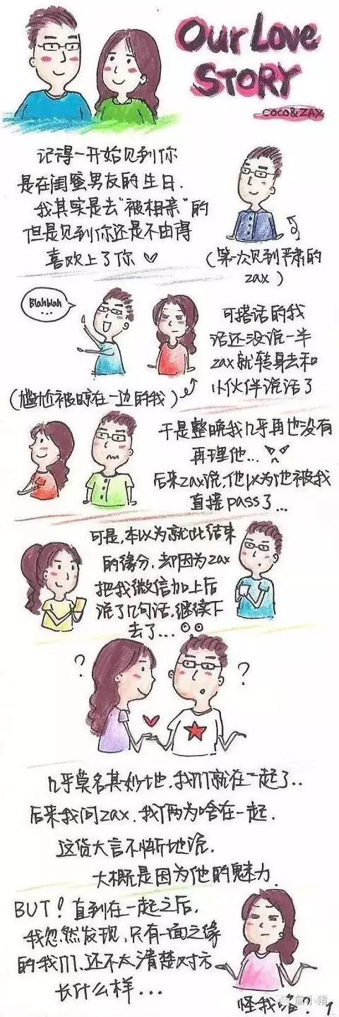Coco第一次遇见男票,是在闺蜜的生日。没想到“被相亲”的她一眼就喜欢上了这个略带严肃的小伙子。可搭话的Coco话还没说一半,就被“心上人”晾在了一边。“他以为他直接被我pass了,所以一个晚上都没再说过话。”这段小插曲也被她画进了漫画。