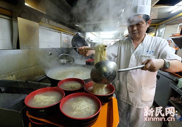 【新民晚报·新民网】上午10点30分,离中午饭点还有半个小时,福州路600号老半斋酒楼就已经人头攒动,队伍从柜台排到了店门口。副总经理张永华身穿白色工作服、脚踩套鞋,亲自在厨房熬汤下面;大堂经理朱翠华则在外面端菜送饭,一刻不得闲。看到两位经理亲自压阵,员工更是卖力,全店上下忙得手脚齐飞。