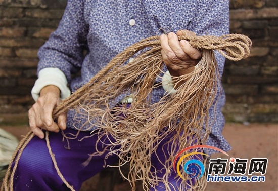 阿婆说她公公当年织蓑衣送给红军,支持琼崖革命,后来被国民党反动派杀害。之前她跟着公公帮忙,学会了织制蓑衣手艺。蓑衣披在身上是衣服,放在地下可当床,盖在身上是被子。阿婆说蓑衣不仅能防雨挡风也可以当被子盖,以前家里穷,小孩都是盖蓑衣长大的。阿婆介绍说编织蓑衣的材料主要用油葵叶,要去离家4公里远的“万宁岭”上割采,红藤也要去山上割,割来红藤后将藤丝搓成线,线织红麻绳,只是现在编制蓑衣的油葵叶和红藤越来越难找了,编织一件蓑衣也要费好多功夫。