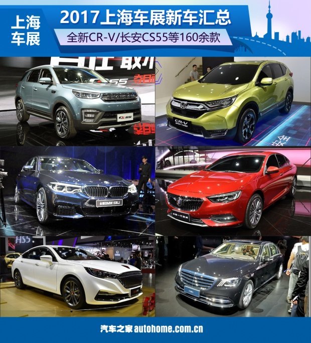 [汽车之家新闻] 4月19日,2017上海车展于国家会展中心(上海)正式拉开了帷幕,在此次车展上共有160余款新车上市/首发,包括本田全新CR-V、别克全新君威、宝马全新5系长轴距版、全新长安CS55、新款S级、奔驰Concept A Sedan概念车、雪铁龙天逸等诸多重磅车型。关于这些车型的具体信息,我们将会在本文中为您呈现。接下来,让我们进入正文吧。