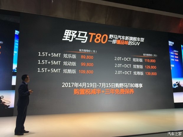在2017上海车展上,野马汽车的全新SUV车型——野马T80正式上市,新车共推出1.5T和2.0T两种排量,共计6款车型。指导价格为8.98-13.98万元。
