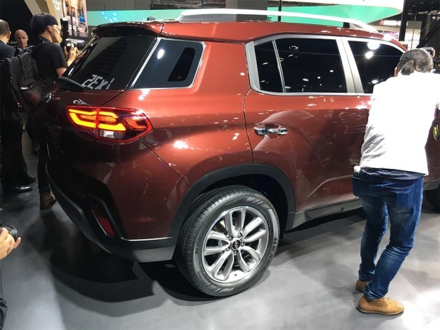 相比于现款车型,尾部最主要的变化在于尾灯及后包围。尾灯造型与北京现代ix25相近,缺乏新意。后包围增加了镀铬饰条更显精致,同时新车取消了现款车型上的双边共两出的排气设计,位于两侧的两个货真价实的排气管隐藏在后包围下方。