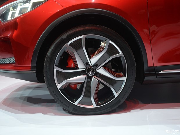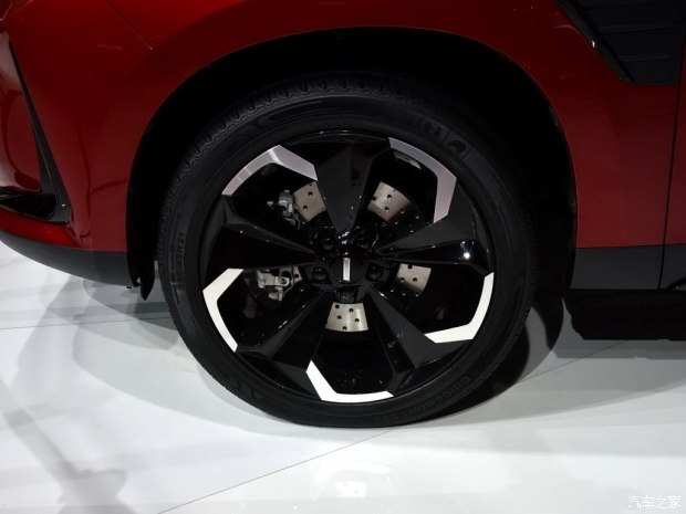 车身侧面,从前翼子板出发的线条在车尾形成悬浮式车顶结构,从大灯眼角出发的腰线则在后排车门处与轮拱线条完成交接,塑造出挺拔有力的车身轮廓。当然,多色多辐式轮圈也是车身侧面的点睛之笔,与车身同色的红色卡钳烘托出了整车的运动感。