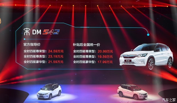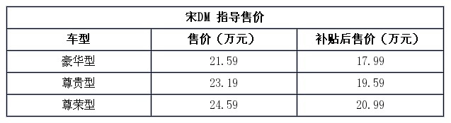 4月17日,比亚迪宣布旗下宋新能源车型——宋DM(插电式混动版)和宋EV300(纯电动版)正式上市,其中宋DM补贴后售17.99-20.99万元,比亚迪宋EV300补贴后售19.99-20.99万元,详细售价请见下表。此外,比亚迪还额外给予首批1万名用户各1万元的电费,能充1万6千6百度电,行驶超过8万公里,相当于普通新能源车5年的行驶里程。